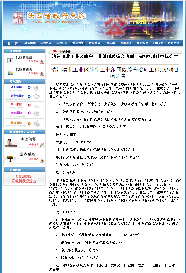 清河渭北工業(yè)區(qū)航空工業(yè)組團段綜合治理PPP項目于2018年1月19日進行了公開招標,經(jīng)評標委員會評審,推薦以啟迪桑德環(huán)境資源股份有限公司牽頭,與中建三局集團有限公司、西安市水利建設(shè)工程集團有限公司、中國市政工程華北設(shè)計研究總院有限公司組成的聯(lián)合體中標。